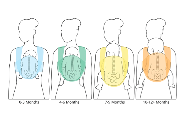 The other thing that is important – and it’s not well illustrated in the above picture – is that the baby’s knees should be supported and held up higher than their bums. I like this next image as it shows how the baby’s positioning will change as they age. You can see that throughout the stages the carrier seat is nice and wide and gives support right to the baby’s knees and the bent knee is always held higher than their bums.