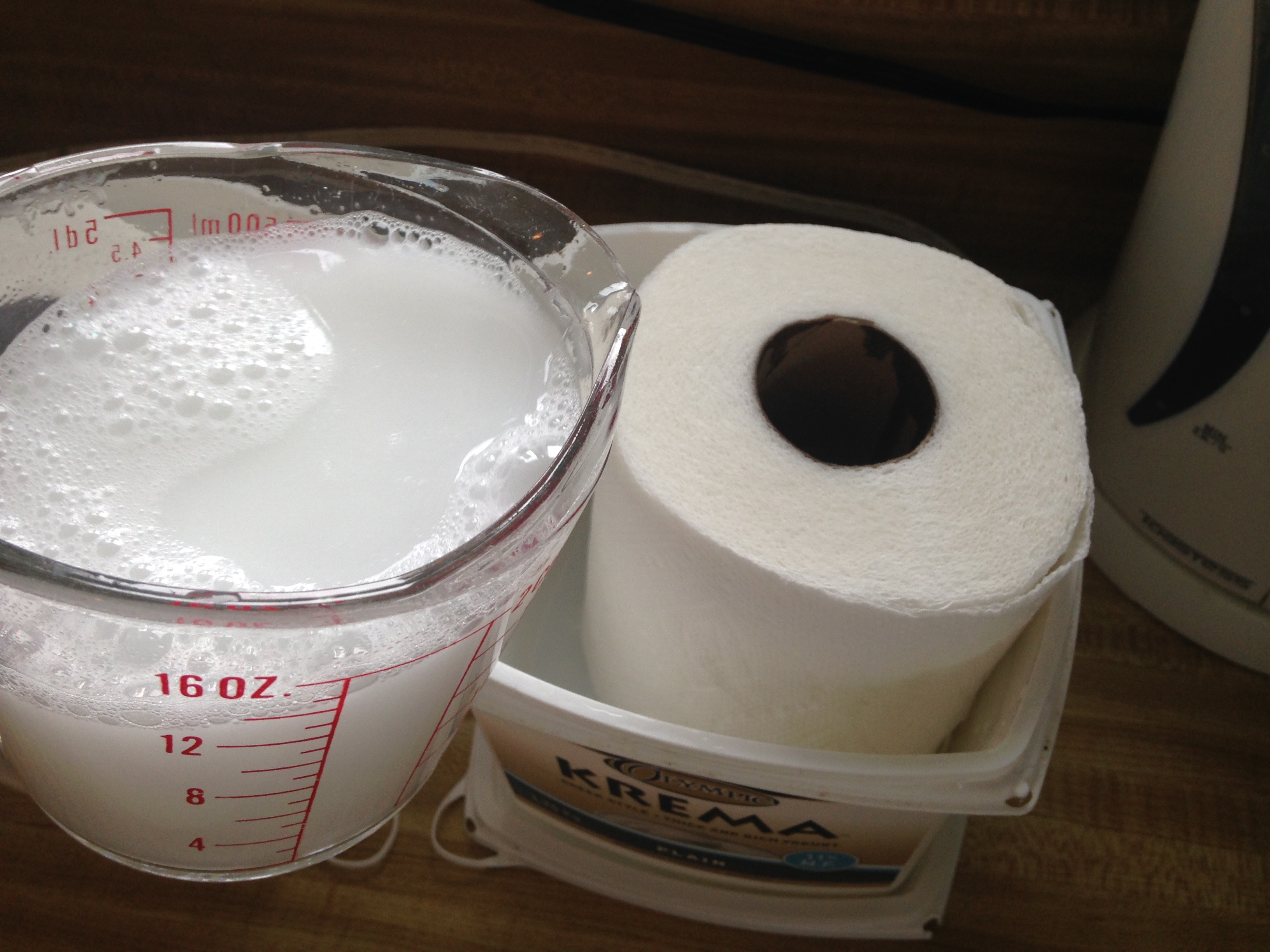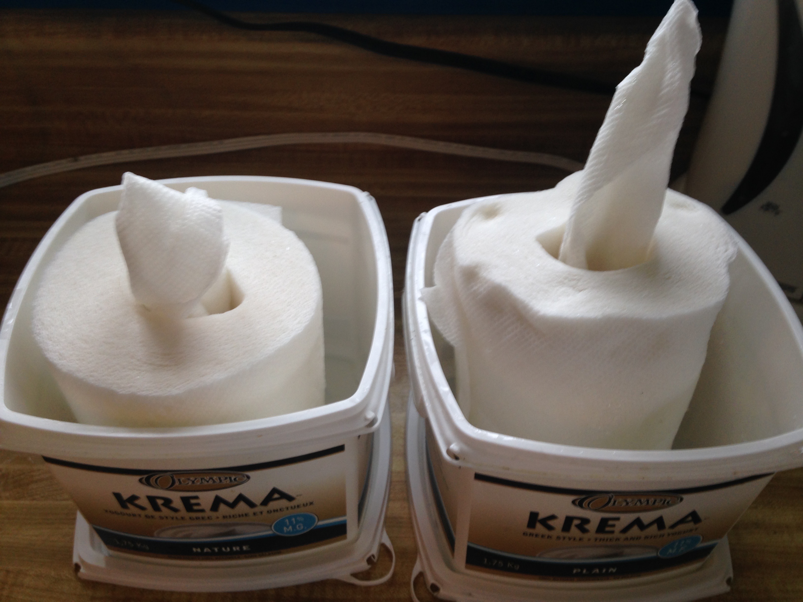 2 containers big enough to fit 1/2 roll of paper towel in them (I used yogurt containers that I had saved)
