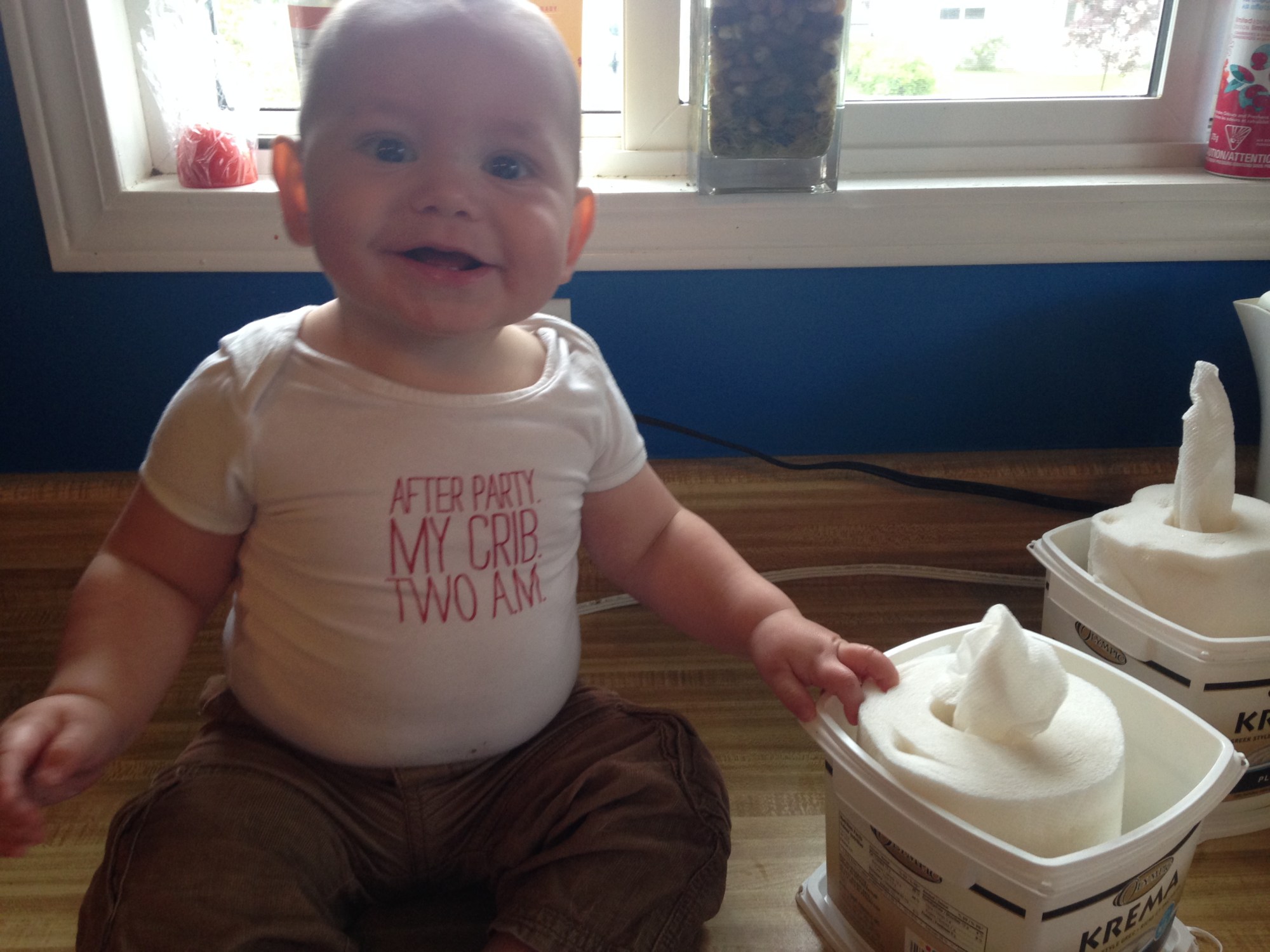 My friend Dana texted me the other day saying, “I’d like to post how to make homemade wipes!” and with her message she included a picture of her stinkin’ cute 8-month-old sitting next to two batches, ready-made.