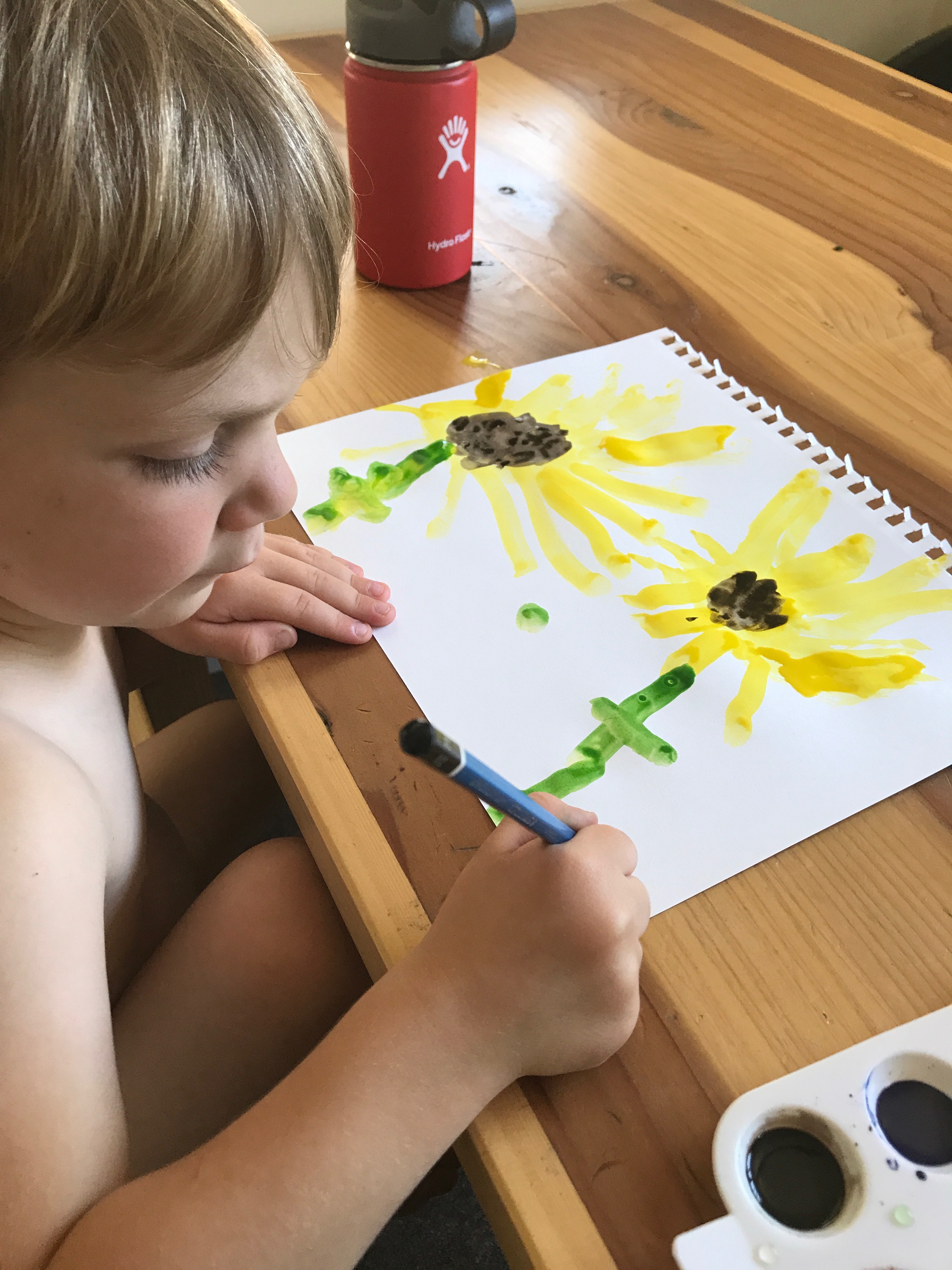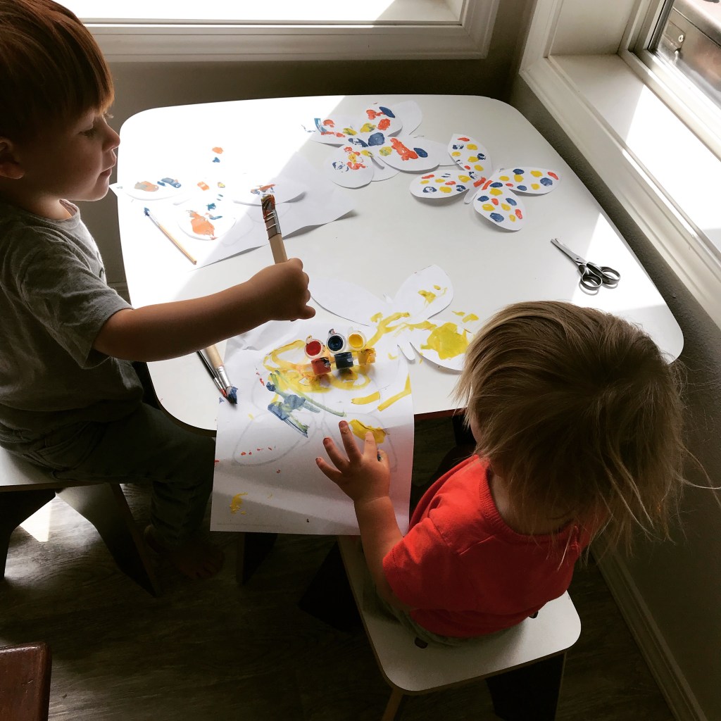 Thank you! So, the majority of the time, I just let them draw however they want without any direction from me. But for certain projects I decide beforehand that I will be their Art Teacher and step more into that roll. With the butterfly painting, we referenced a book of butterflies and I helped him notice the shape and proportions of the wings of each butterfly he chose to draw and I looked/breathed over his shoulder as he drew them. Some parts needed to be erased and redrawn – and I would show him why we were redrawing that spot. When it came to the actual painting, I definitely micromanaged, sometimes (OK, most of the time) even dipping the brush into the right color paint for him. The final product looked awesome and he was so proud of it. He didn’t even realize how much I was helping him — in his mind he created the entire painting (because he did!) Projects like this are great opportunities for them to learn some technique while still technically creating the entire thing by themselves.