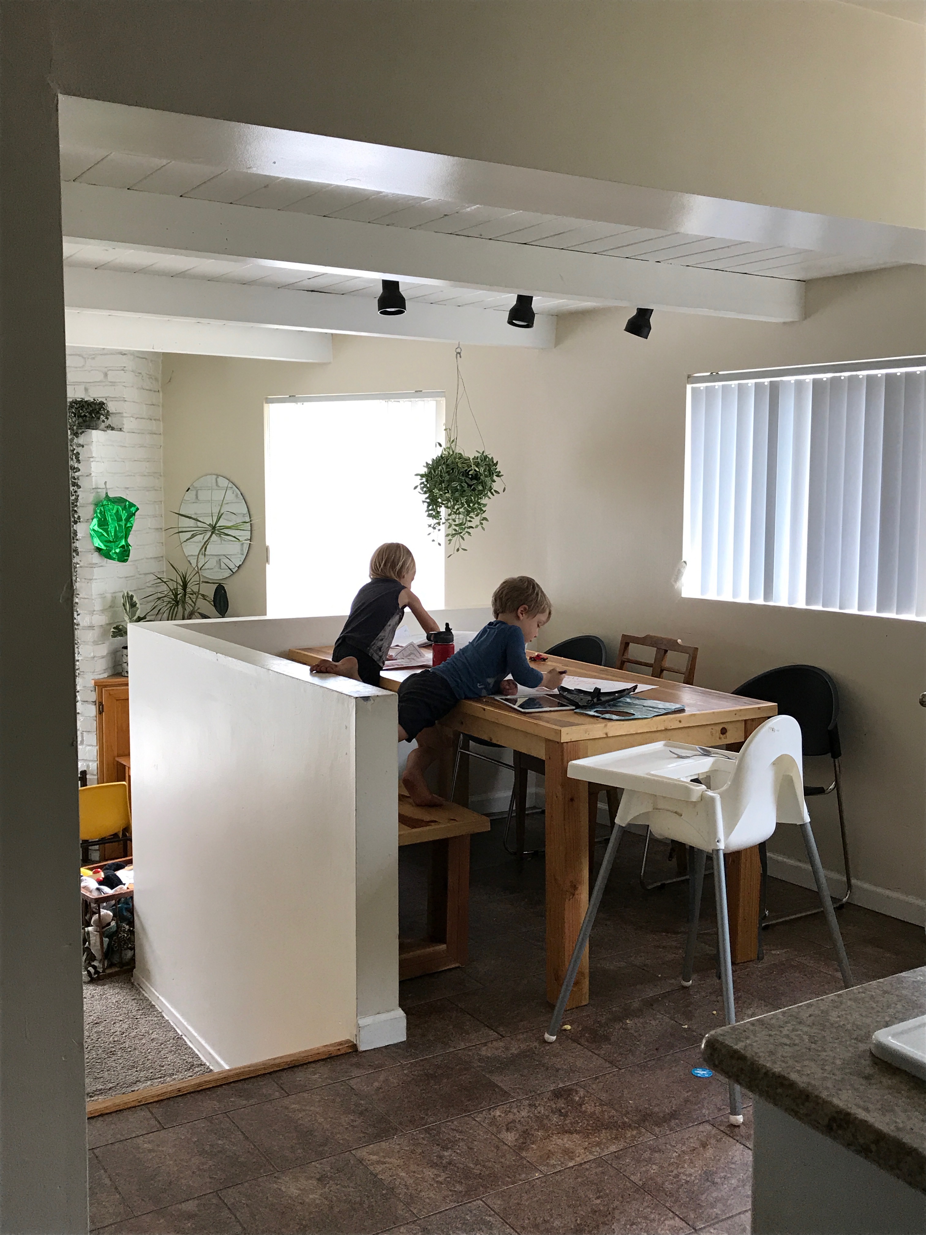 Our dining table is where all the art projects happen. The supplies are out on the table the majority of the time but are housed on a shelf that the kids can easily reach them and put them back.